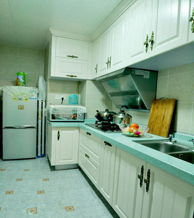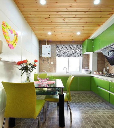 開放式的廚房能節省不少空間,蘋果綠色很漂亮,桌靠墻擺放 留出的過道恰恰好。