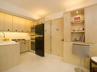 開放式的廚房,空間雖小,卻樣樣齊全,色調與客廳是一致的。