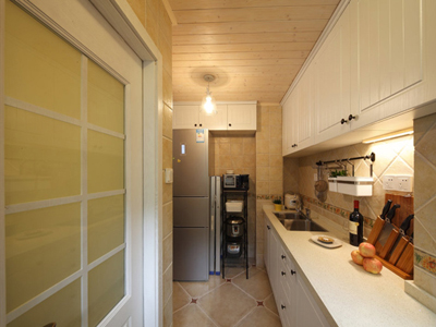 廚房的空間是狹長的,做了很多的柜子,鐵藝的掛件置物架是廚房收納的選。