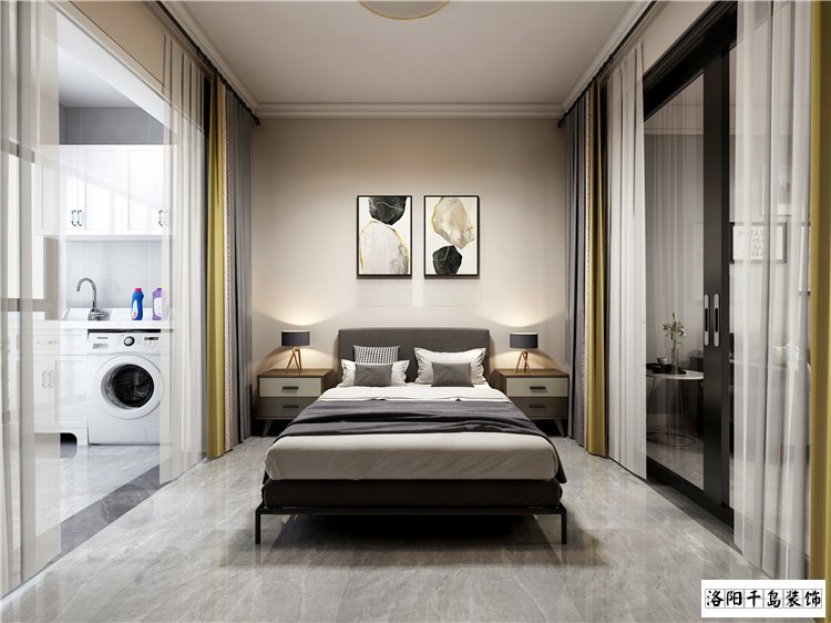 其實(shí),客廳被“擠”出一個(gè)房間后,采光通常就會(huì)受影響,這時(shí)候我們可以通過“借光”的方式來解決,通常的做法是使用玻璃磚或者鋼化玻璃來代替隔墻,本案例就是通過透明玻璃推拉門作為空間的分割,保證采光的同時(shí),配合窗簾也有很好的封閉私密空間。