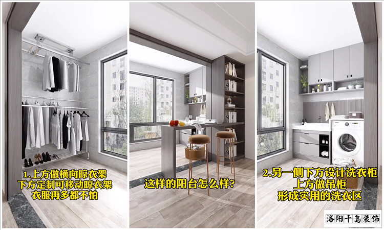 1、陽臺一側上方做橫向晾衣架,下方定制可移動晾衣架,衣服再多都不怕;