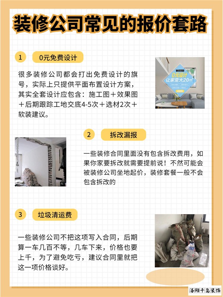 2023洛陽裝修公司排名哪家好?100平的戶型全包,套餐裝修公司只報價10萬,大部分人會認為比自己裝還便宜,認為自己撿到了大便宜。我勸你還是別做這春秋大夢了,你以為洛陽裝修公司都是搞慈善的嗎?今天千島裝飾就給你揭秘一下裝修報價都有哪些套路。