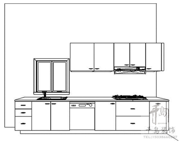 廚具主要是沿著墻面一字排開,區域劃分的重點為冰箱-工作臺-洗滌區-處理區-烹飪區-用膳區,佳空間長度大約為2公尺。由于空間的限制,櫥柜應貼墻布置以適應空間的特點和滿足功能的需求,烹飪用具不能過多,對櫥柜高度要仔細安置。