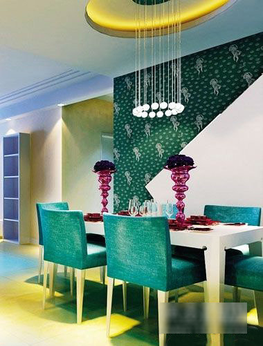 餐廳的家具布置簡潔,燈光的變幻使得開放式的空間獨立且充滿情趣。內凹式的圓形吊頂內壁采用了黃色的燈槽裝置,形成弧形光暈,籠罩了整個餐廳空間。